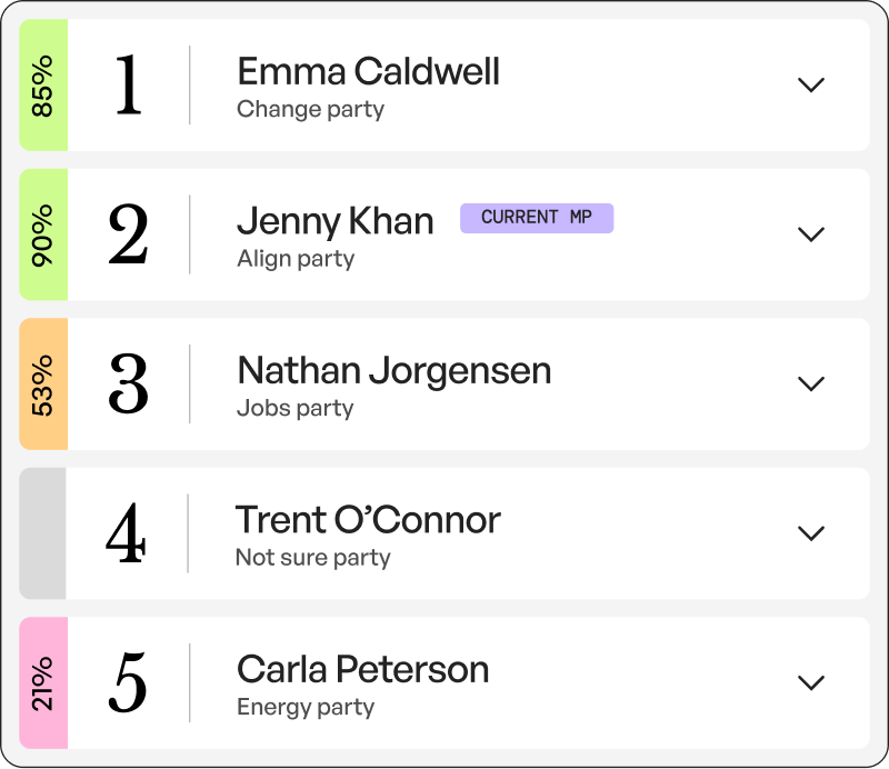 First, you’ll answer a short series of questions about the big issues impacting you this election — think housing, the cost of energy bills and access to healthcare. Based on your results, Build a Ballot calculates a ‘match level’ with the candidates in your electorate.